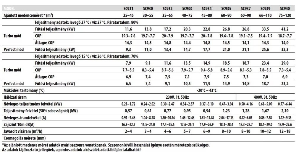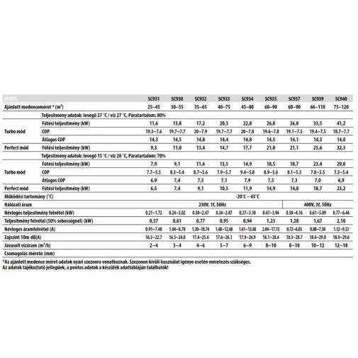 Teljesítmény adatok: levegő 15 °C / víz 26 °C, Páratartalom: 70%