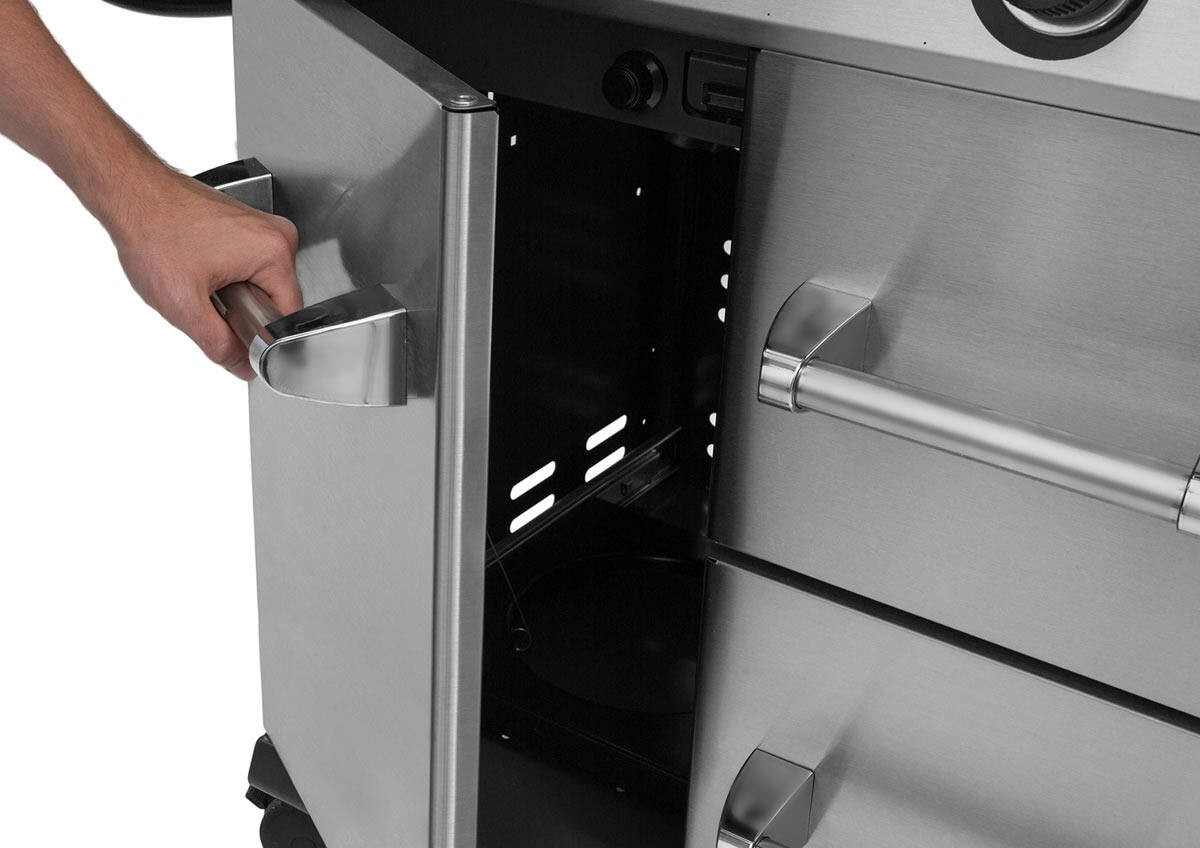 A hatalmas gázgrill két, egymástól teljesen függetlenül is üzemeltethető sütőrésszel rendelkezik, melyek saját tetőt kaptak, így a látvány mellett a sokoldalúságára sem lehet panasz. Minőségi alapanyagainak köszönhetően a jókora rakodótérrel és 6 Dualt-Tube™ égővel felszerelt grill egész évben gond nélkül használható, a rozsdamentes acél szerkezetért és a kifejezetten tartós öntött vas rácsokért még szélsőséges időjárás esetén sem kell aggódni. Mérete ellenére még kezdő grillezők számára sem jelent gondot a működtetése: a könnyű begyújtásról a gombnyomásra bekapcsolható elektronikus rendszer felel, míg a tökéletes hőeloszlást és hőtartást a Flav-R-Wave™ szállítja. Kis és nagy társaságok számára egyaránt ideális és az optimálisan kiegyensúlyozott nyárs még a nyárson sült húsok kedvelőinek is tartogat kellemes meglepetéseket. A sütést igazi élménnyé változtatja az Imperial 690 IR, ami beépített világítással, 4 rozsdamentes sütőráccsal, 2 két oldalas öntött vasráccsal, strapabíró kerekekkel és polcokkal lopja be magát a szívekbe.
