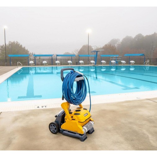 De a Caddy nemcsak a Dolphin medencetisztító biztonságos tárolására és egyszerű szállítására szolgál, hanem helyet kínál kezelő panelének és a kábeleknek is.