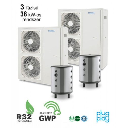 – 2 db Domusa Dual Clima RT 19 kW-os 1 fázisú levegő-víz hőszivattyú 3 év teljeskörű, és 5 év kompresszor garanciával.