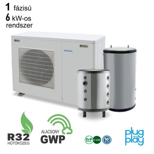 DOMUSA - 6 kW-os 1 fázisú Levegő-Víz hőszivattyús rendszer fűtésre, és vagy hűtésre, használati melegvíz ellátásra komplett beüzemeléssel