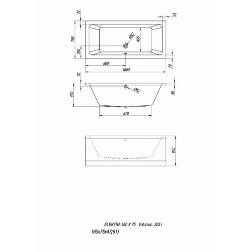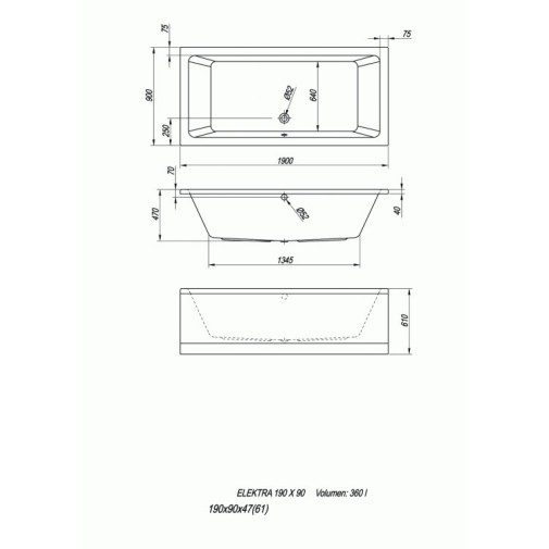 Elektra 190/O 190x90 beépíthető fürdőkád Vízmasszázs I. mikrofúvókákkal.