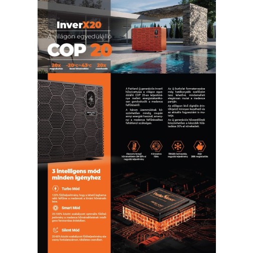 Tipp: Medencéd hőveszteségéhez illesztve egy X20 hőszivattyú állandóan Silence módban üzemelhet, mely során egy átlagos lakossági medence pár száz watt teljesítménnyel hőn tartható, illetve a napi hőveszteség vissza fűthető.