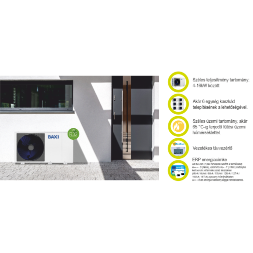 A BAXI Auriga 12T-A monoblokk rendszerű levegő-víz hőszivattyú 1 kW villamos energia felhasználásával akár 4-5x annyi fűtési (hűtési) energiát képes az épület falán belülre juttatni. A szükséges teljesítménynek a 80%-át a külső levegő hőtartalmát hasznosítva a környezetből nyeri, ahol a hő egész évben korlátlanul rendelkezésre áll.
