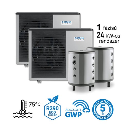 – 2 db Domusa Dual Clima HT 12 kW-os 1 fázisú levegő-víz hőszivattyú 3 év teljeskörű, és 5 év kompresszor garanciával.