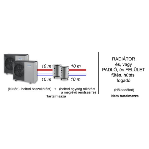 – Az ár tartalmaz anyag, és munkadíj oldalon 10 m csővezetés a beltéri egységek, és a meglévő, vagy kiépített gépészet között, a hozzá tartozó idomok szerelvényekkel (ha nagyobb a csövezési távolság, akkor méterenként 8.500 Ft-al emelkedik a díj pl.: ha 10 méterrel hosszabb akkor 85.000 Ft).