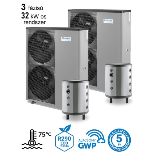 – 2 db Domusa Dual Clima HTT 16 kW-os 3 fázisú levegő-víz hőszivattyú 3 év teljeskörű, és 5 év kompresszor garanciával.