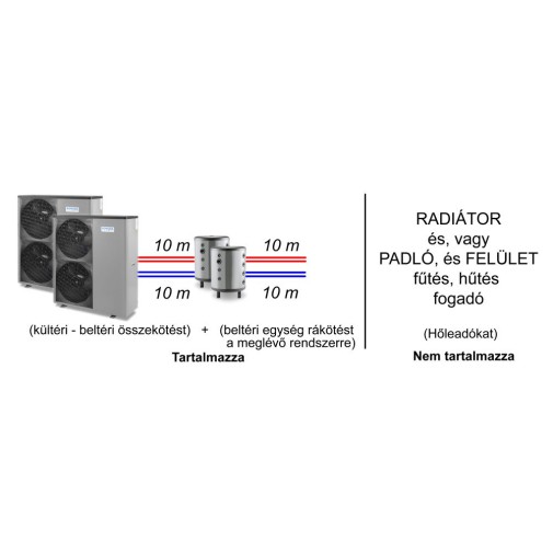 – Az ár tartalmaz anyag, és munkadíj oldalon 10 m csővezetés a kültéri, és beltéri egység között, és a hozzá tartozó idomok szerelvények (ha nagyobb a csövezési távolság, akkor méterenként 8.500 Ft-al emelkedik a díj pl.: ha 10 méterrel hosszabb akkor 85.000 Ft).