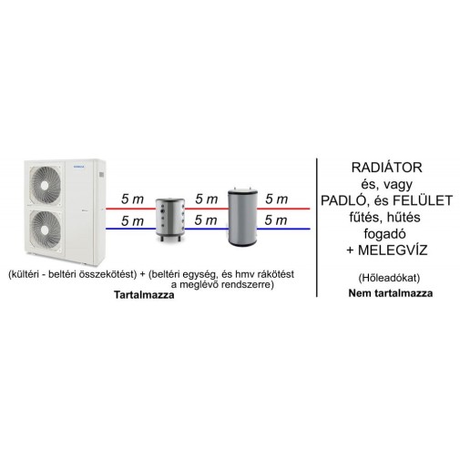 – Az ár tartalmaz anyag, és munkadíj oldalon 5 m csővezetés a kültéri, és beltéri egység között, és a hozzá tartozó idomok szerelvények (ha nagyobb a csövezési távolság, akkor méterenként 8.500 Ft-al emelkedik a díj pl.: ha 10 méterrel hosszabb akkor 85.000 Ft).