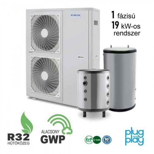 – 1 db Domusa Dual Clima R 19 kW-os 1 fázisú levegő-víz hőszivattyú 3 év teljeskörű, és 5 év kompresszor garanciával