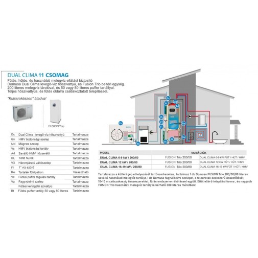 A Domusa Dual Clima levegő-víz hőszivattyúkhoz mindent házon belül lehet megvásárolni, nem kell külsős megoldásokat használni (mert nincs saját tartálya, szelepe, vagy akármilye)! A Domusa egyedi BTS fagyvédelmi rendszert fejlesztett ki, így biztosítva a Monoblokk hőszivattyúk rettegett fagyvédelmét, vagy például a kis helyet foglaló Fusion Trio, vagy BT Trio tartály amely biztosítja a hűtő fűtő puffert, és a hmv rendszer 2-in-1. Több különböző kulcsrakész megoldást tudunk kínálni az épületszerkezet, és a kiépített hőleadókhoz igazítva. Fontos, hogy mindezt kulcsrakész csomagban teljes telepítéssel együtt valósítjuk meg!
