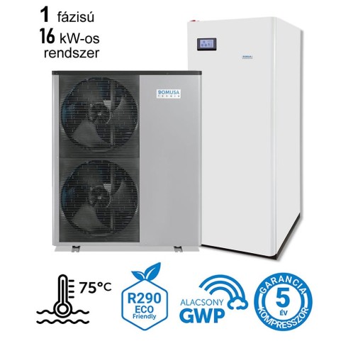 – 1 db Domusa Dual Clima HT 16 kW-os 1 fázisú levegő-víz hőszivattyú 3 év teljeskörű, és 5 év kompresszor garanciával