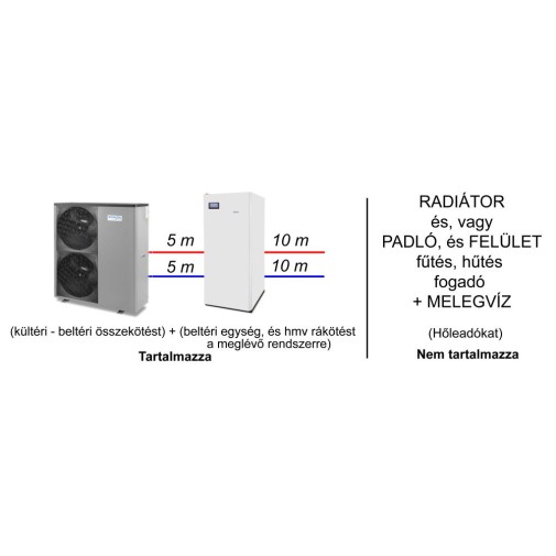 – Az ár tartalmaz anyag, és munkadíj oldalon 10 m csővezetés a beltéri egységek, és a meglévő, vagy kiépített gépészet között, a hozzá tartozó idomok szerelvényekkel (ha nagyobb a csövezési távolság, akkor méterenként 8.500 Ft-al emelkedik a díj pl.: ha 10 méterrel hosszabb akkor 85.000 Ft).