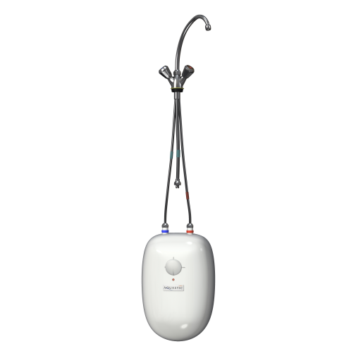 5 literes alsó elhelyezésű, szabadkifolyású ("átfolyós": nem kell biztonsági szelep hozzá, a csaptelepen keresztül csöpög ki a táguló víz) vízmelegítő, mini villanybojler, kétgombos csapteleppel.