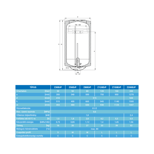 Hajdu Z120 zártrendszerű, elektromos fűtésű, fali függőleges villanybojler, hőszigeteltsége és szabályozása révén megfelel a legszigorúbb ErP követelményeknek.