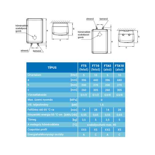 A kis helyigényű készülékek csak függőleges helyzetben szerelhetők fel mosdókagyló, mosogató, konyhai pult alá. Az FT.. típusjelű vízmelegítők esztétikus formájúak, külső burkolatuk szögletes, anyaguk magas fényű, fehér színű ABS műanyag.