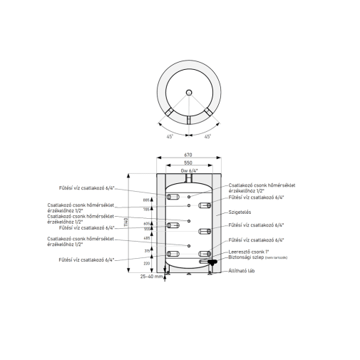 A csatlakozások a puffertartály elejétől jobbra és balra 45?-os szögben helyezkednek el