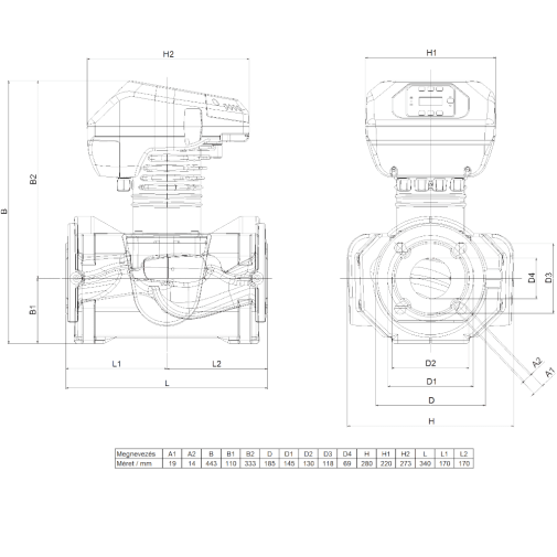 Karimás csatlakozás: DN 32, 40, 50, 65 – PN 6/10/16; DN 80 és 100 – PN 6