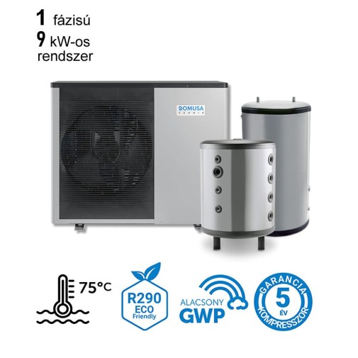 – 1 db Domusa Dual Clima HT 9 kW-os 1 fázisú levegő-víz hőszivattyú 3 év teljeskörű, és 5 év kompresszor garanciával.
