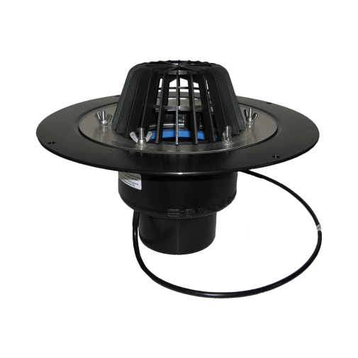 Tetőlefolyó DN110 szigetelőkarimával, szorítóele mmel, 10-30W/230V fűtéssel, hőszigeteléssel, lombfogó kosárral.