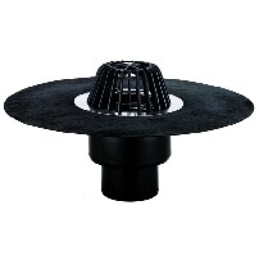 Tetőlefolyó DN110 szigetelőkarimával, szorítóele mmel, gyárilag felhegesztett bitumengallérral, hőszigeteléssel, lombfogó kosárral.