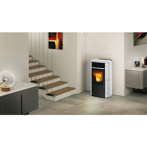 Pellet kályha különböző színben választható kerámia oldalakkal, fedőlappal és intarziával: tejszín fehér és vörös.