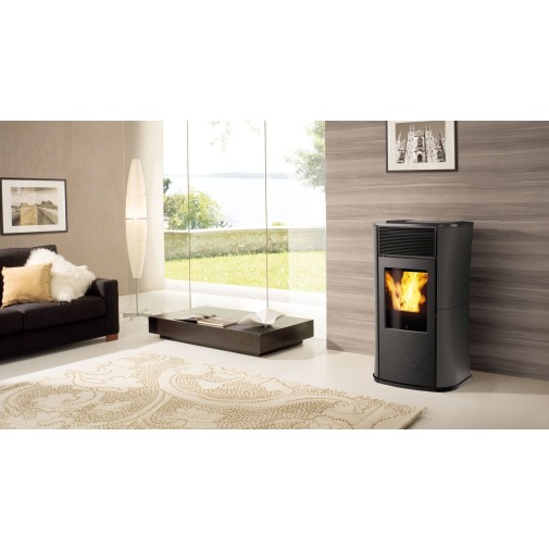 Pellet kályha puha vonalvezetéssel, kapható sötétszürke acél oldalakkal, sötétszürke üvegtetővel és szürke elöl.