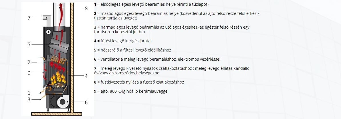 Csúcstechnológiával készült tűztér, felfelé tolható síküveges ajtaja kerámiaüveggel ellátott. A külső levegő közvetlenül az égéstérbe jut, mely garantálja az optimális égést. A speciális kerámia égéstérben keringő levegő elosztása biztosítja az üveg belső felületének tisztán tartását.