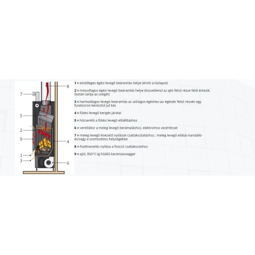 Csúcstechnológiával készült tűztér, felfelé tolható prizmatikus ajtaja hajlított kerámiaüveggel ellátott. A külső levegő közvetlenül az égéstérbe jut, mely garantálja az optimális égést. A speciális kerámia égéstérben keringő levegő elosztása biztosítja az üveg belső felületének tisztán tartását.