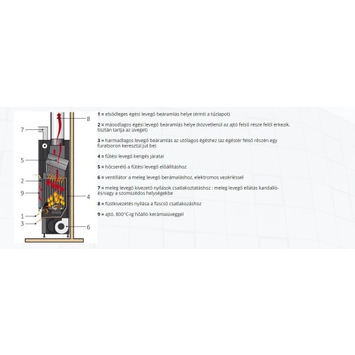 A meleg levegő cirkuláció természetes légáramlással vagy ventillátoros rásegítéssel működhet. Az opcióként választható kit 2 flexibilis csövén keresztül elcsatornázható a felmelegedett levegő.