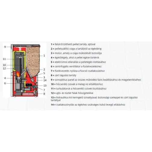 gazdaságos a hagyományos fűtőanyagokkal szemben, környezetbarát, mert fa fűrészport hasznosít, így az égés egyensúlyban van a környezettel, és praktikus, mert lehetővé teszi a felhasználó igényei szerinti programozást.