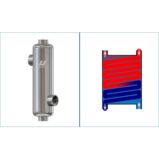 A hőátadó felületet egyenes csőköteg alkotja, ahol a bordázottság biztosítja a jobb hőleadást és csökkenti a lehetséges lerakódás mértékét.