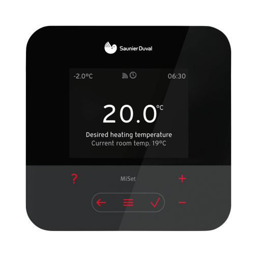 A Saunier Duval új MiSet szabályozója külsőleg teljesen megújult: kiváló minőségű alapanyagokból készül és háttérvilágított LCD panellel rendelkezik. Az intuitív működésű kezelőfelület a különböző programozási funkciók ellátására 6 darab érintőgombból áll.