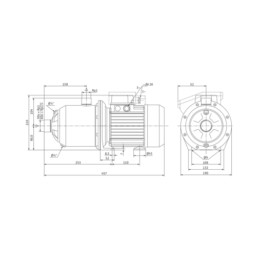 Többfokozatú, csendes, normál szívású, vízszintes nagynyomású centrifugálszivattyú blokk kivitelben vízszintes szívócsonkkal és függőleges nyomócsonkkal. Megszakítás nélküli motor-szivattyútengellyel és forgásiránytól független csúszógyűrűs tömítéssel.