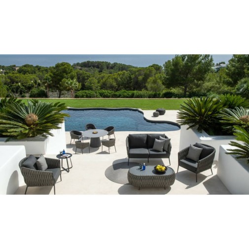 A Jati & Kebon Fortuna kávézóasztal alumínium váza ellenáll az időjárás viszontagságainak. UV álló, szürke vastag textil fonású támlája teszi igazán izgalmassá, vízlepergető párnával rendelhető.
