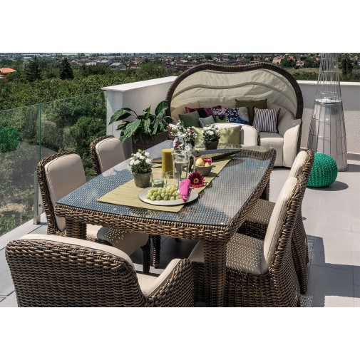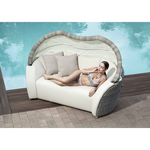 A Luxor két személyes kanapéján ülve még a teraszra tűző nap sem jelenthet akadályt, a lehajtható tető még a legforróbb nyári napokon is kellemes, árnyas ülőhellyé varázsolja ezt az elegáns kerti pihenőbútort. Az ETHOS Luxor kerti bútor termékcsalád kis kanapéja a mediterrán könnyedséget sugallja. Akár tűz a nap, akár szemerkél az eső, teteje alatt meghúzódva gyönyörködhetünk a kertünk szépségében.