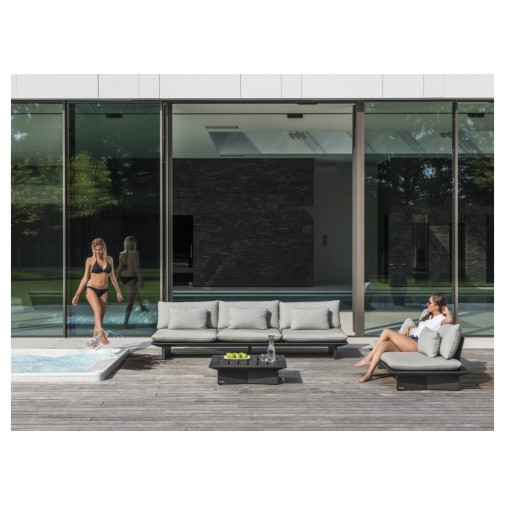A Jati&Kebon porszórással festett alumínium váza a jachtok fedélzetén is előszeretettel használt Sunbrella szövetanyaggal kiegészülve válik igazán különlegessé. Az időjárás viszontagságainak is ellenálló kültéri szöveteket készítő Sunbrella a gyártás során színes festékpigmentekkel itatja át a pamutszálakat, majd egy folyékony akril bevonattal vonja be a szövetet. Ez az eljárás a szálak belsejébe zárja a színt, így az anyag nem fakul, UV és vízálló lesz. A prémium minőségű bútor tisztítása szintén gyerekjáték: a legtöbb szennyeződés egyszerű szappanos vízzel is eltávolítható.
