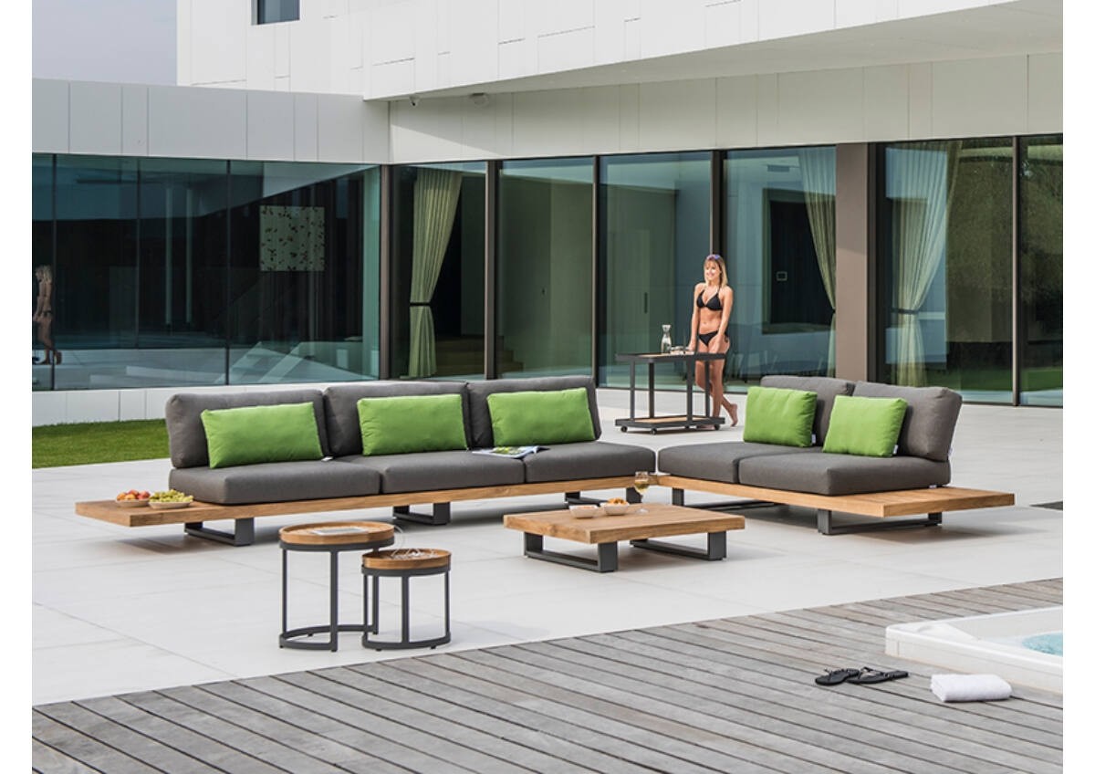 A Truro ülőgarnitúra indusztriális stílusú kültéri ülőbútor. Robusztus megjelenését fém lábai hangsúlyozzák. Letisztult vonalvezetése, stílusos megjelenése miatt minden modern teraszra tökéletesen illik. A könnyű, de nagy teherbírású alumínium elemek modern és letisztult formavilággal rendelkező bútoraink alapanyagai, a teakfa nyers és természetes karaktert kölcsönöz termékeinknek. Az alumínium-teakfa párosítás igazán stílusos és ízléses. Az időjárás viszontagságainak ellenálló szövetek pedig gondoskodnak az ülőfelületek könnyedségéről és kényelméről.