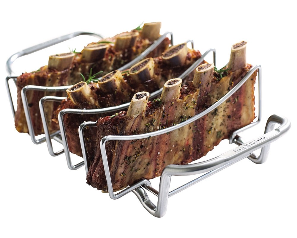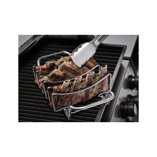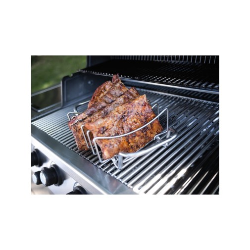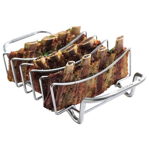 Ebben egyszerre öt bordarészt készíthetsz, melyek egymástól jól elkülönülten sülnek majd ropogósra. Igény szerint még tálaláshoz is használhatod a sütést segítő rácsot (kihűlés után), mert a húsok ízlésesen helyezkednek el benne és könnyen hozzáférhetőek. De a bordasütőt nagyobb, egyben sült húsokhoz is használhatod. A rács felépítése lehetővé teszi, hogy az enyhén íves felületű rekeszek tetejét vedd igénybe a nagy húsok támogatására. A hús szinte felfekszik a felületre, ezért a leesésétől sem kell tartanod, sőt még fogóval sem kell bajlódnod, mert a sütőrács két oldalán jól megmarkolható fülek segítik a hús grillre helyezését és mozgatását.
