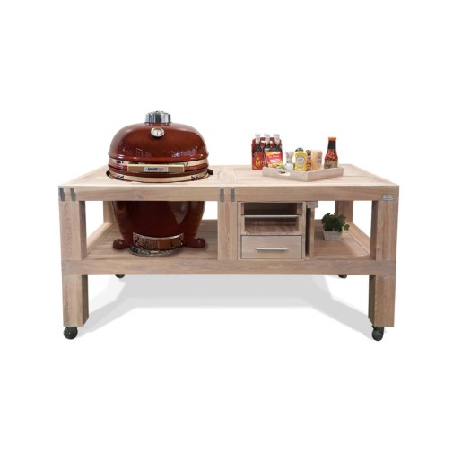 Tömör tölgy fából készült masszív kamado grill asztal fiókkal, szalvétatartóval és kerekekkel. Nemes megjelenése igényességet kölcsönöz a hagyományos kamado grillnek. Nagy munkafelülete kényelmesebbé teszi az ételek előkészítsét.