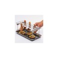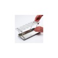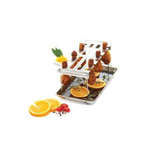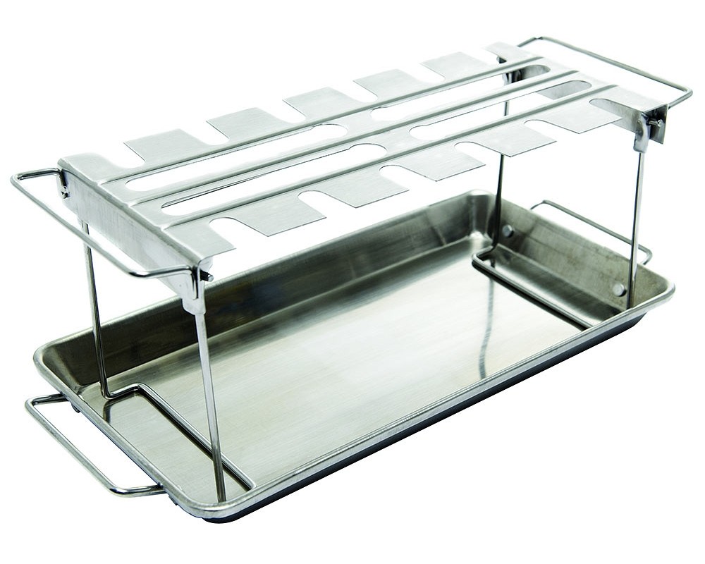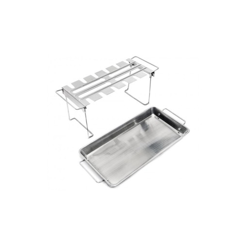 A Broil King csirkecomb sütő szettje egy rozsdamentes acél tálcával és egy abba pontosan belepasszoló combtartóval érkezik, ami a sütésben és a tálalásban is kitűnő segítőtárs. A tartóba az alsó combon kívül természetesen más csirkerész is felakasztható: szárny, felső comb vagy kisebb csirkedarabok is kerülhetnek is. A tálca plusz fűszerek, ízesítők tárolására is használható és felfogja a lecsöpögő zsiradékot is, így megakadályozza az étel megégetésével fenyegető láng felcsapásokat. Az akasztó pedig abban segít, hogy a húsnak ne kelljen érintkeznie a ráccsal, és ezzel megelőzhetővé válnak a nem kívánatos leragadások. A szett mindkét eleme használható egyébként külön-külön is.