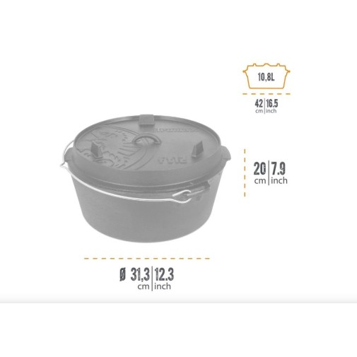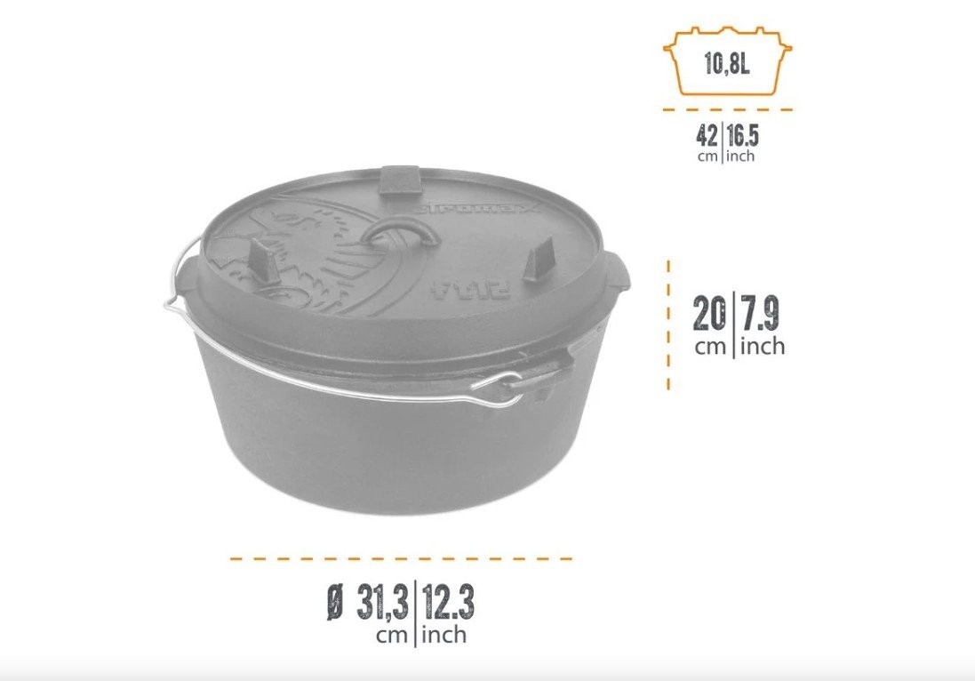 A Petromax Dutch Oven, lapos aljú öntöttvas lábas (11,5 liter, Ø 36 cm) lapos aljú változata sokoldalúan használható gáz-, elektromos vagy indukciós tűzhelyeken, valamint nyílt tűzön. Az öntöttvas kiváló hőtartása és előkezelt felülete garantálja a tökéletes főzési eredményt és a könnyű tisztítást. Nagy adagokhoz ideális, tartós és megbízható edény.