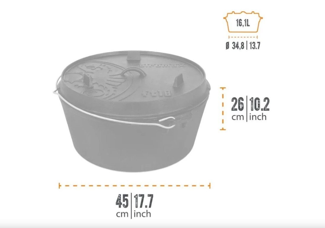 Nagy kapacitású lapos aljú Dutch Oven öntöttvas lábas 16 literes, ideális beltéri és tűzön főzéshez, sütéshez, pároláshoz nagy adagokhoz. Kiváló hőmegtartás és egyenletes eloszlás – tökéletes kempingben, grillezésnél vagy otthon. Sokoldalú outdoor főzőedény német prémium minőségben.