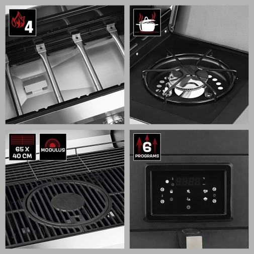 A három grillrács 65 x 40 cm-es grillezőfelülettel elegendő helyet kínál hús, hal vagy akár tofu számára is, az oldalégő főzőlapján, a beépített cooK zónában pedig elkészítheti pl. a burgonyát, szószokat vagy zöldségeket, és emellett lehetősége van ropogós sült krumpli tálalására is.