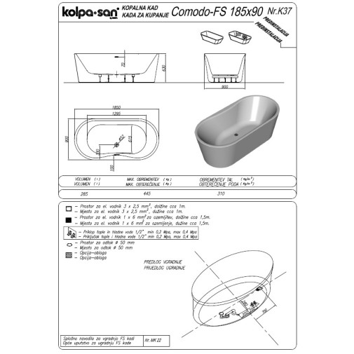 Kolpa San - COMODO-FS 185X90/MO BLUE/WHITE, SZABADON ÁLLÓ FÜRDŐKÁD LEVEGŐ MASSZÁZSRENDSZERREL, LE- ÉS TÚLFOLYÓVAL, A KÁDTEST ÉS AZ ELŐLAP EGYBEÖNTVE