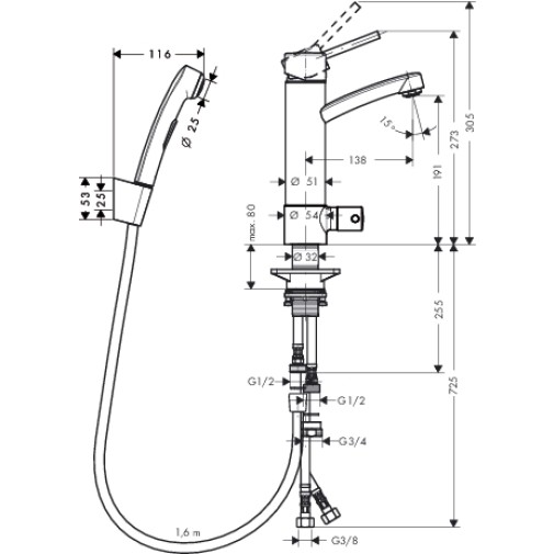 Egykaros mosdócsaptelep készülék elzárószeleppel és bidette 1jet kézizuhannyal/ Porter'S zuhanytartó szettel