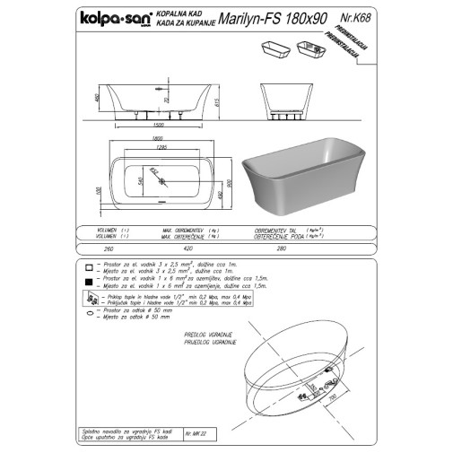 Kolpa San - MARILYN-FS 180X90/O BLUE/WHITE SZABADON ÁLLÓ FÜRDŐKÁD, LE- ÉS TÚLFOLYÓVAL, A KÁDTEST ÉS AZ ELŐLAP EGYBEÖNTVE