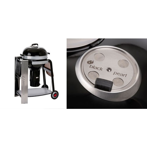A fekete gyöngy (black pearl select) faszenes gömbgrill - sokoldalú grill élmény és vonzó megjelenés.. Az innovatív OptiHeat rendszerrel - köszöntően a grillezőrostély egyedi magasság állítási lehetőségének – a kolbászok és húsok különösen ízletesen, szaftosan készíthetők el akár 10 személy részére. OptiHeat rendszerű. Zománcozott fedél és tűztér. Hőálló zománcozott faszénrács. A zománcozott kémény optimális hőáramlást biztosít. A zománcozott elemek minimális ápolást igényelnek és nagymértékben korrózió állók. A hamu gyűjtő doboz kényelmes és tiszta módja a hamu kiürítésének. Két faszén elosztó az indirekt grillezéshez. Krómozott grillező rostély. A fedélbe épített légáramlás szabályzó az ételek direkt és indirekt grillezéséhez. Beépített hőmérséklet kijelző a pontos elkészítési idő meghatározásához. Hővédett ergonomikus fogantyúk. A két lehajtható polc (kiváló minőségű fa és fém polcok ital tárolóval) optimális helykihasználást biztosít. Gumikerekek a gyors és biztonságos mozgatáshoz. Grillrács átmérő: 56 cm összsúly: 33 kg