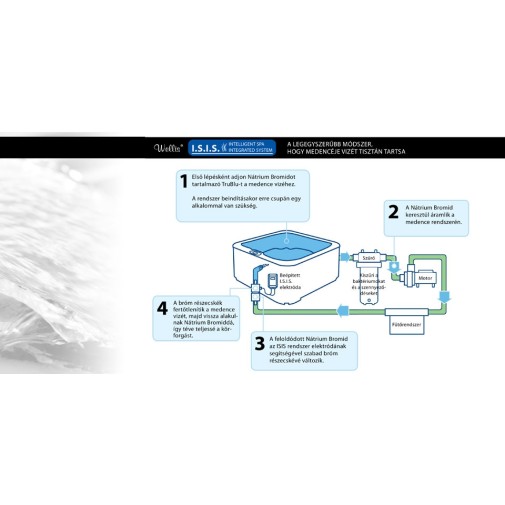 A medencékbe beépíthető I.S.I.S. rendszer garantálja az évi egyszeri alkalommal adagolt -tengeri sóhoz hasonló- nátrium bromid természetes bróm ionok formájában való folyamatos áramoltatását, ezzel biztosítva a tökéletes kikapcsolódáshoz szükséges vízminőséget.