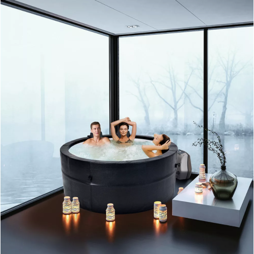 Nagy méretű dézsa jakuzzi 4-6 főre, elegáns fekete bőrhatású borítással.